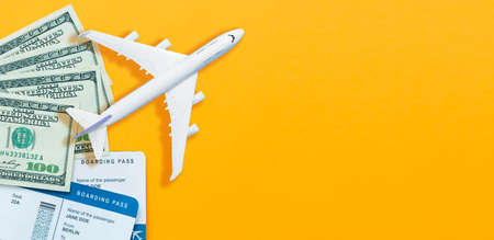 Travel preparation concept of airplane, money, passport, on yellow background. Selective focus.holidays