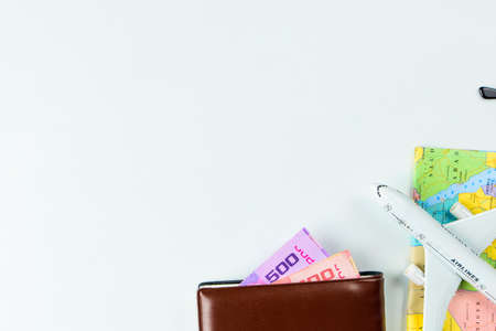 Travel accessories costumes concept for summer vacation trip. Thailand Passports, luggage, map, smartphone,sun glasses,camera, note pad, jean on white.
