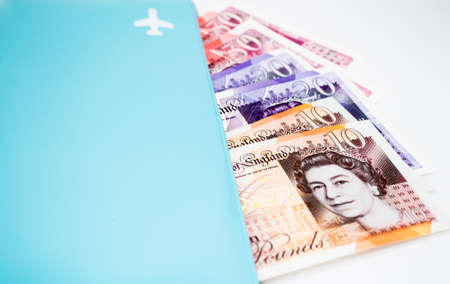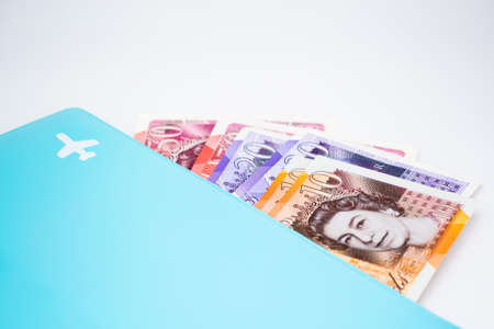 Moscow, Russia, February 2020: A pile of ten, twenty and fifty pound notes is visible from a blue folder with an airplane sign. The concept of trips to the UK.