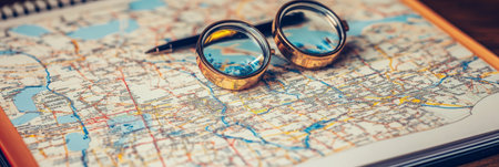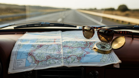 Road trip adventure. Map and compass on car dashboard. Sunglasses ready for travel. Exploring new destinations.