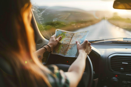 A woman behind the steering wheel of a vehicle, glancing at a map while adjusting the rearview and automotive mirrors for travel