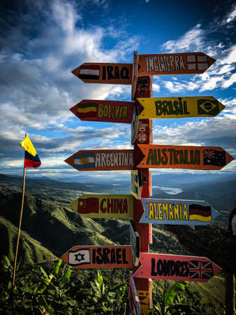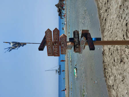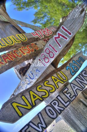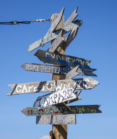 Signage on a wooden post to world wide destinations with blue sky. Sign with distances and directions to destination countries and cities from current location. Travel photo, nobody