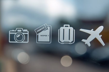 Travel-themed stickers featuring a camera, plane, passport, and suitcase are arranged diagonally, creating a sense of excitement for upcoming adventures.