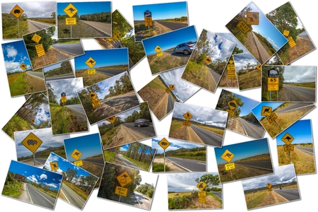 Australian road signs collage of kangaroo, koala, wombat, devil and penguin crossing road in Australian States of Victoria, New South Wales and Tasmania.