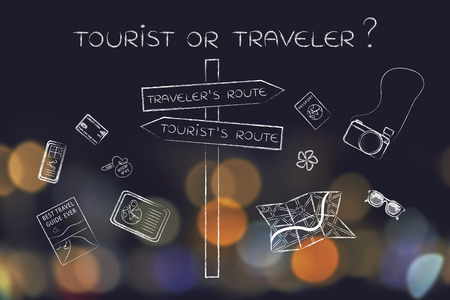 traveler or tourist's route: crosspath road sign with opposite directions and mixed objects
