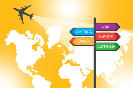 Air connections between countries. Concept of air travel because of business. Airplane silhouette on background of world map. Airplane as a symbol of tourism industry. Business in tourism industry
