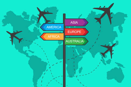 Green world map with flying airplanes. Dashed trace road line illustration. Air travel planning concept. Choosing a place for air travel. Location marks in continents as a symbol travel