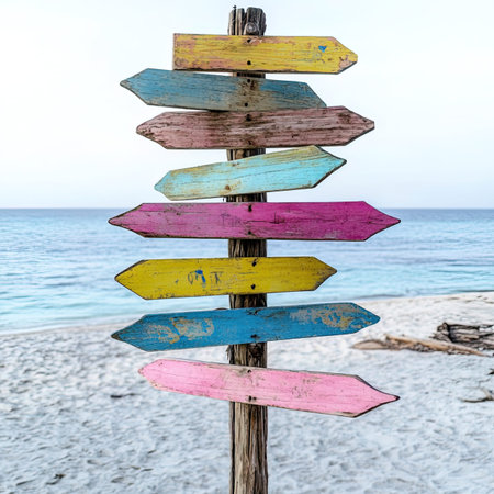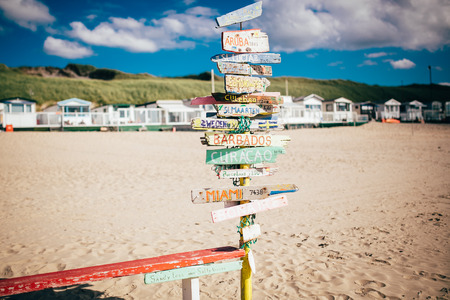 Colorful wooden signpost at the beach in Thailand. Landscape.