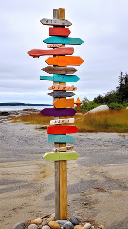 A reddish wooden post stands on clear sand among lush green trees, providing directions for tourists visiting the island. Explore the natural beauty and serenity of the surroundings as you navigate your way with ease