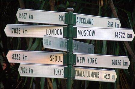 A directional sign showing distances to the nearest landmarks at the bottom of the South Island, New Zealand
