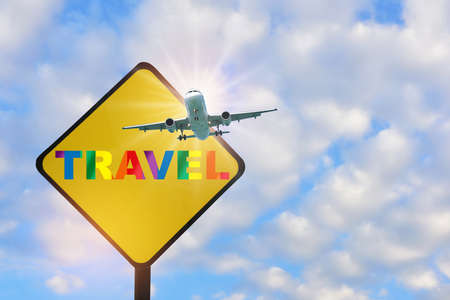 Airplane travel and colorful rainbow travel word written on yellow sign on beautiful blue sky with fluffy cloud background. Rainbow lesbian gay bisexual transgender concept and equality diversity idea