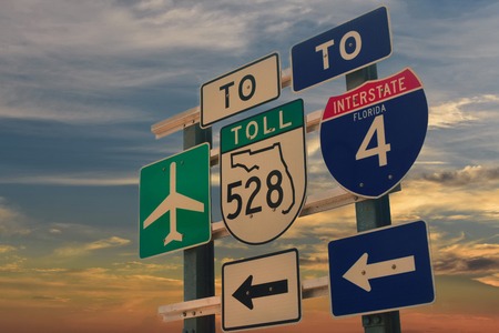 Airport sign on beautiful sunset sky background in International Drive Area.