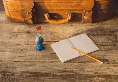 Suitcase, nootbook, pencil, flag on wooden plancs. Aim, attainment, target, tourism, travel.