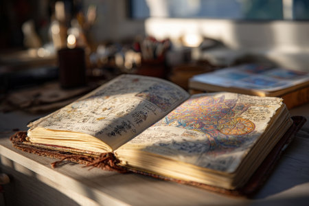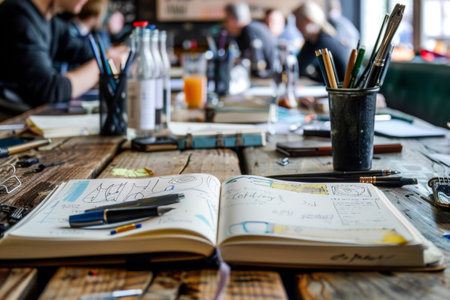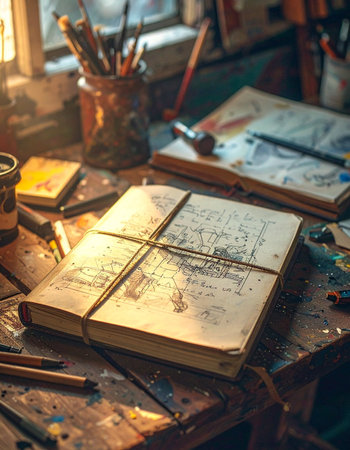 In the quiet corner of a sunlit workshop, an old journal filled with sketches and notes lies tied, holding secrets of past adventures and future plans.
