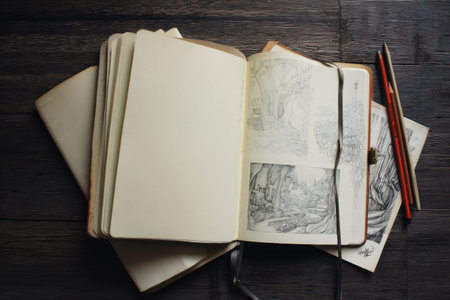 Open sketchbook reveals unfinished graphite drawings alongside pencils, inviting artistic exploration and creative expression in a serene setting.