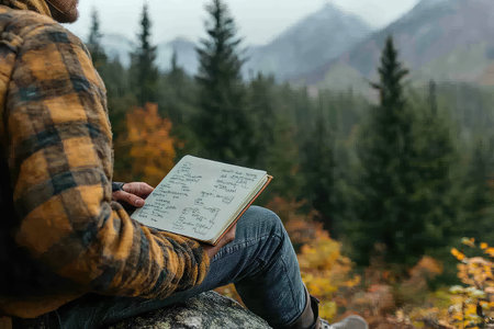 Cropped photo of a man takes notes in a paper notebook while hiking. Surrounded by natures wonders, the hiker captures his thoughts in a notebook, celebrating the essence of adventure.