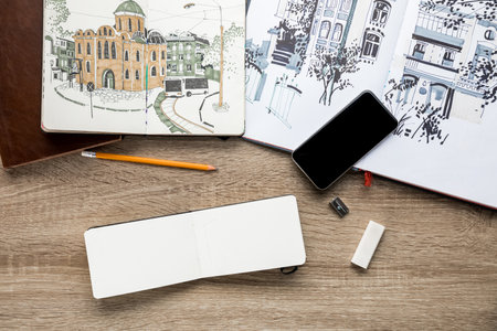 Black and craft sketchbooks with pencils for hatching on a white isolated background. Tools of a professional artist. Top view