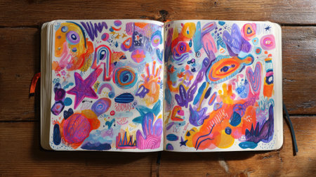 A vibrant notebook adorned with colorful illustrations and whimsical characters, lying on a wooden desk surrounded by colorful markers, showcasing creative potential.