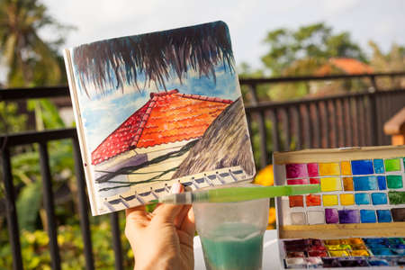 girl paints the landscape in graphics technics. the hand of the girl artist and Album pages, paints, pencils,oil, brush on a wooden background