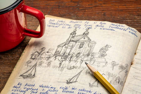 A detail from a 1970s vintage travel journal with handwriting and pencil sketches (property release attached) - post-Camaldolian Monastery in Wigry, Poland.