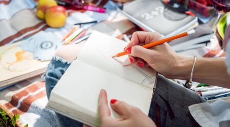 Young woman writing in notebook at home. Close up of female hands with pencils writing in notepad.
