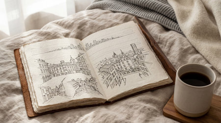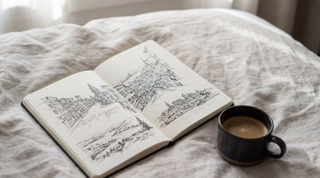 Cozy morning scene with open sketchbook of cityscapes on rumpled bed linens beside a steaming cup of coffee by soft window light.