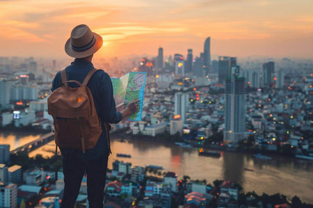 Asia tourist looking at map. Beautiful tourist attractions. generative ai