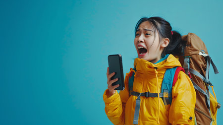 A young woman wearing a yellow jacket and a backpack yells into a smartphone while standing against a blue background.