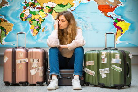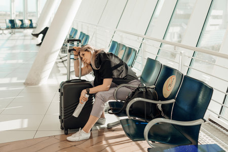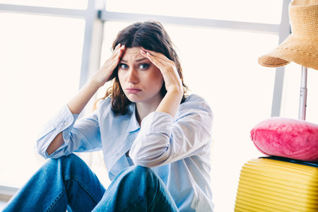 Young woman sitting with luggage at the airport feeling stressed about travel plans while wearing casual attire