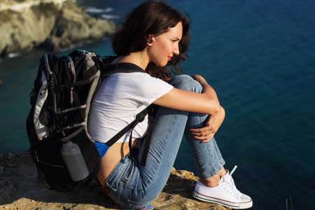 Time to travel sig over a woman with striped straw hat sitting on the shore looking at the ocean under beautiful evening sky with her back to the camera.