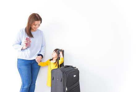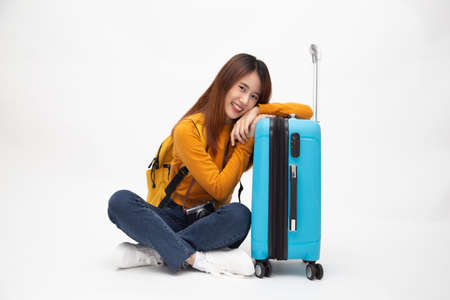 Beautiful Asian woman sitting posing beside suitcase and preparing for travel