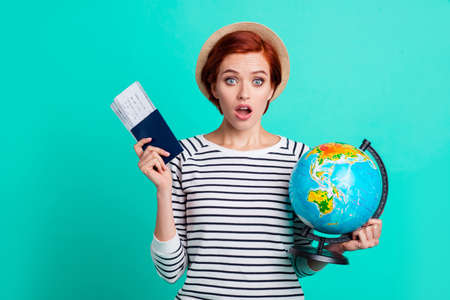 Earth people rest relax resort recreation hot weather concept. Afraid panic stupor speechless with open mouth she her holding document two train tickets globe in hand isolated turquoise background