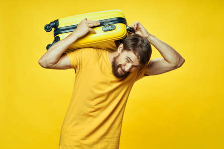 Studio portrait of young African American man with yellow suitcase, playing on it like a guitar, guy on red wall background feeling happy to travel. Summer, holidays, transport, leisure, youth concept