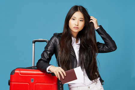 A beautiful woman of Asian appearance leaned her hand on a red suitcase