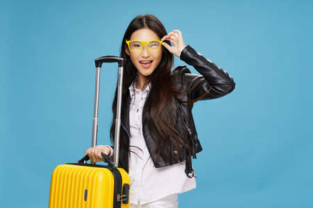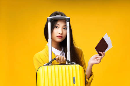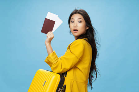 Asian woman with tickets and passport for plane Yellow suitcase and travel tourism blue background