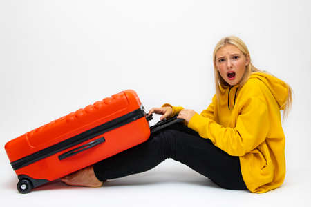 Upset tourist woman in summer casual clothes sit on suitcase put hands on head isolated on yellow orange background. Female traveling abroad to travel on weekends getaway. Air flight journey concept
