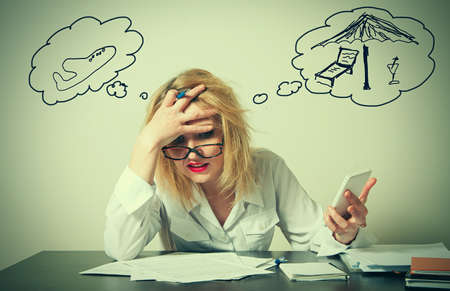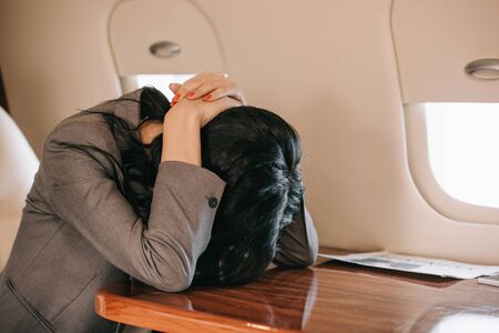 Businesswoman In a plane, covering her face with both hands with the stress.