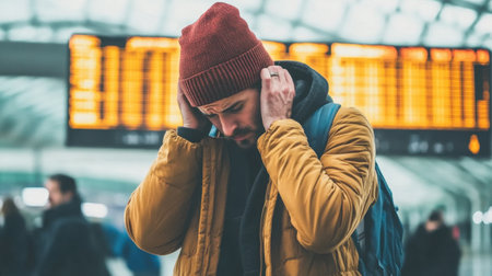 Weary traveler standing in front of a delayed flight board in a bustling airport, illustrating the frustration of travel disruptions.