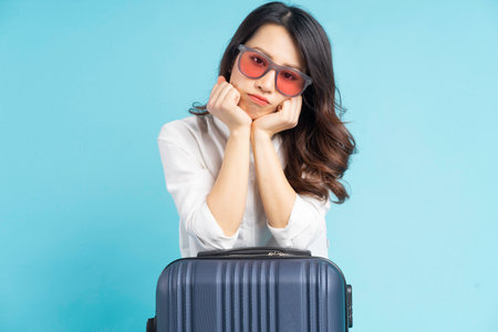 Beautiful young asian woman upset and worry travel summer trip in abroad isolated on blue background, tourist asia girl having problem and stress journey in vacation for leisure, holiday concept.