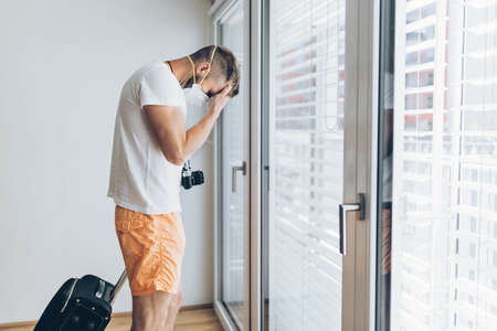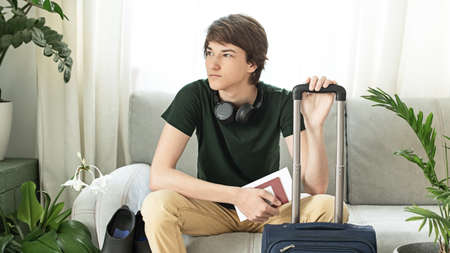 Sad tourist teen with a suitcase and flippers stays at home during the coronavirus pandemic. Cancellation of leave and closing of borders between countries. Flight cancellation