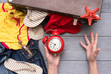 A red alarm clock and open suitcase with clothing. Lack of time to get ready for travel.
