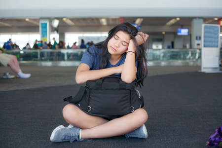 Tired or bored biracial teen girl sitting on floor at airport waiting with luggage