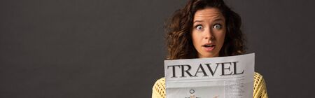panoramic shot of shocked curly woman in yellow knitted sweater holding travel newspaper on black background