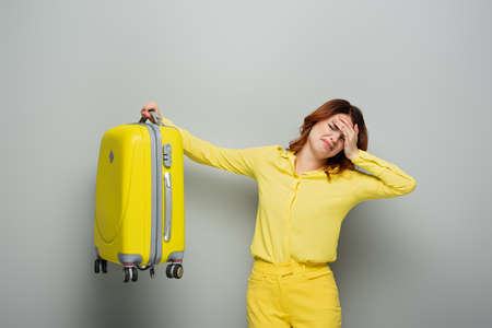 dissatisfied woman standing with closed eyes and touching forehead while holding suitcase on gray