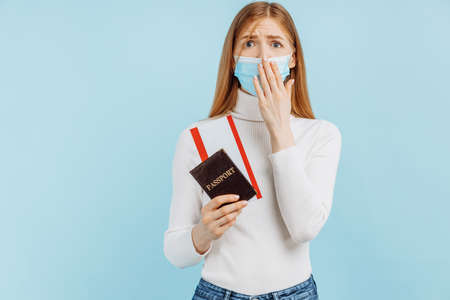 Shocked frightened young woman, in medical mask, holding passport with tickets, on blue background