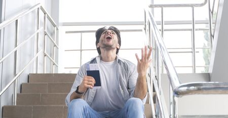 Lost Flight. Desperate Man Sitting In Airport With Passport, Border Closed Due To Coronavirus, Guy Emotionally Yelling Why, Panorama With Free Space