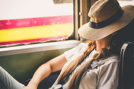 Cute young asian female tourists are sitting on the express train from Narita International Airport go to downtown Tokyo ,Japan