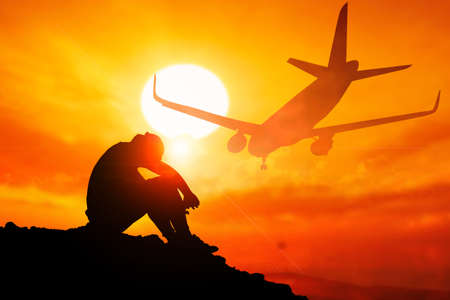 Double exposure of men who lost their jobs in the aviation industry during the coronavirus crisis or COVID-19. The concept of unemployment and despair
