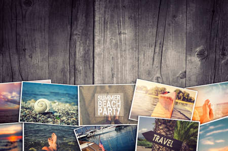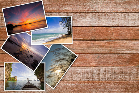 Photo frames with tropical beaches on wooden background with empty space for text. Banner for advertising travel and postcards.
