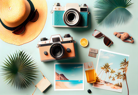 A flat lay composition featuring travel essentials like a hat, camera, and map, evoking a sense of adventure and exploration.